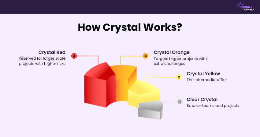 Crystal comes in colours like Clear, Yellow, Orange, and Red, each suited to different team sizes and project risks. It avoids strict frameworks and encourages teams to define their own processes while sticking to core values. Flexibility is key.