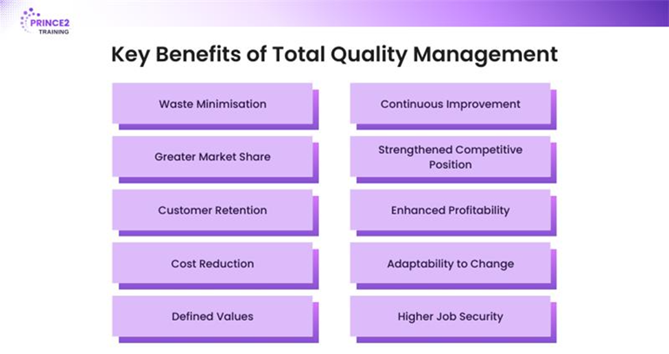 Total Quality Management focuses on removing inefficiencies, waste, and defects from processes. This leads to better-quality products, smoother operations, and fewer errors across the organisation.