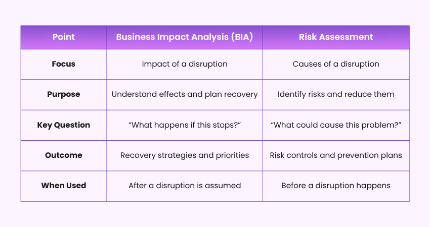 A BIA focuses on what happens after a disruption. It shows how it affects work, money, and customers and helps plan how to recover quickly. A Risk Assessment focuses on what could cause a disruption. It finds possible risks and helps prevent them.