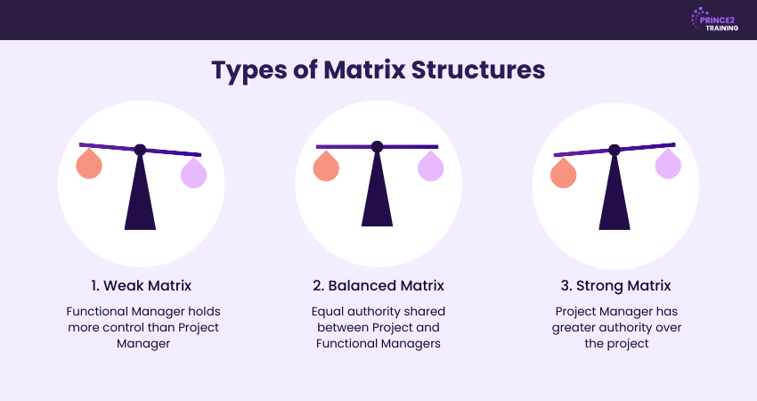 Matrix structures vary based on how authority is shared between Functional and Project Managers. Each type offers a different level of control, collaboration, and decision-making. Below are the three main types of Matrix structures explained clearly.