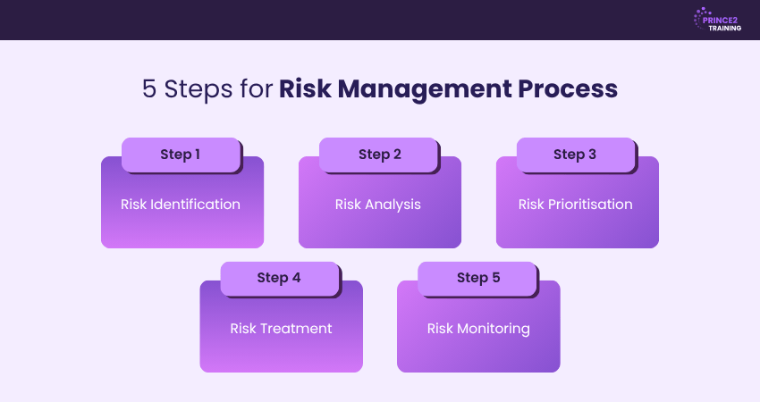 The Risk Management Process follows a structured five-step approach, ensuring risks are managed effectively and proactively.