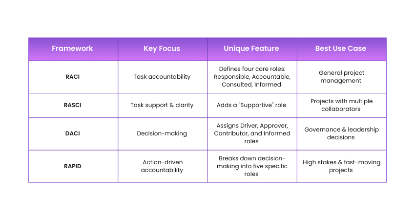 While RACI is a great framework, it’s not the only option. Here are some alternatives: