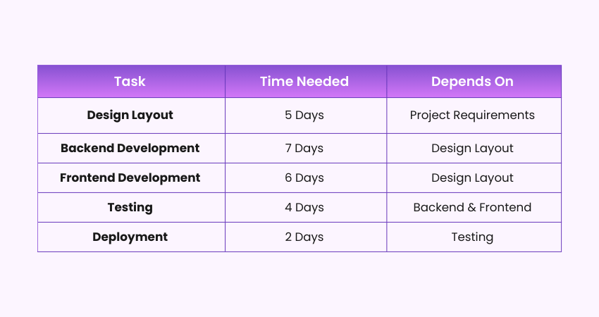The Critical Path Method (CPM) helps find the longest chain of tasks that determines how long a project will take. Let’s see an example: