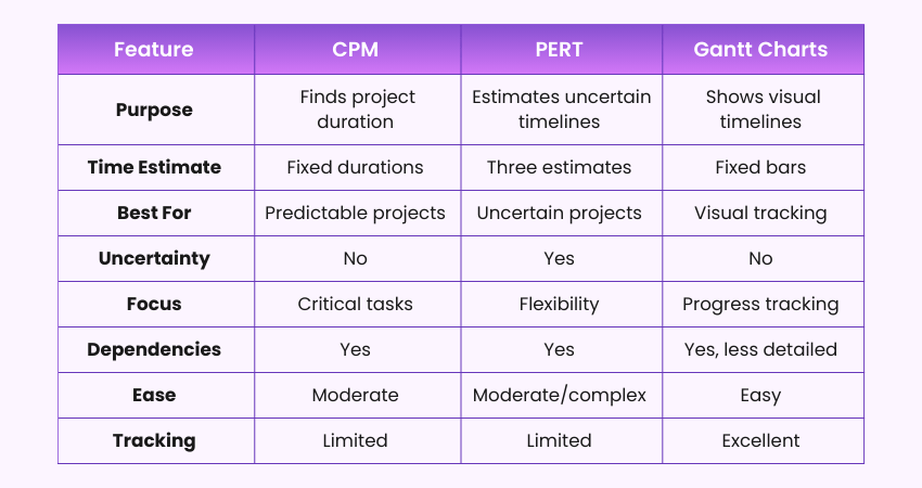 The Critical Path Method (CPM), Program Evaluation and Review Technique (PERT), and Gantt charts are all Project Management tools. Here is the comparison between CPM vs PERT vs Gantt Charts: